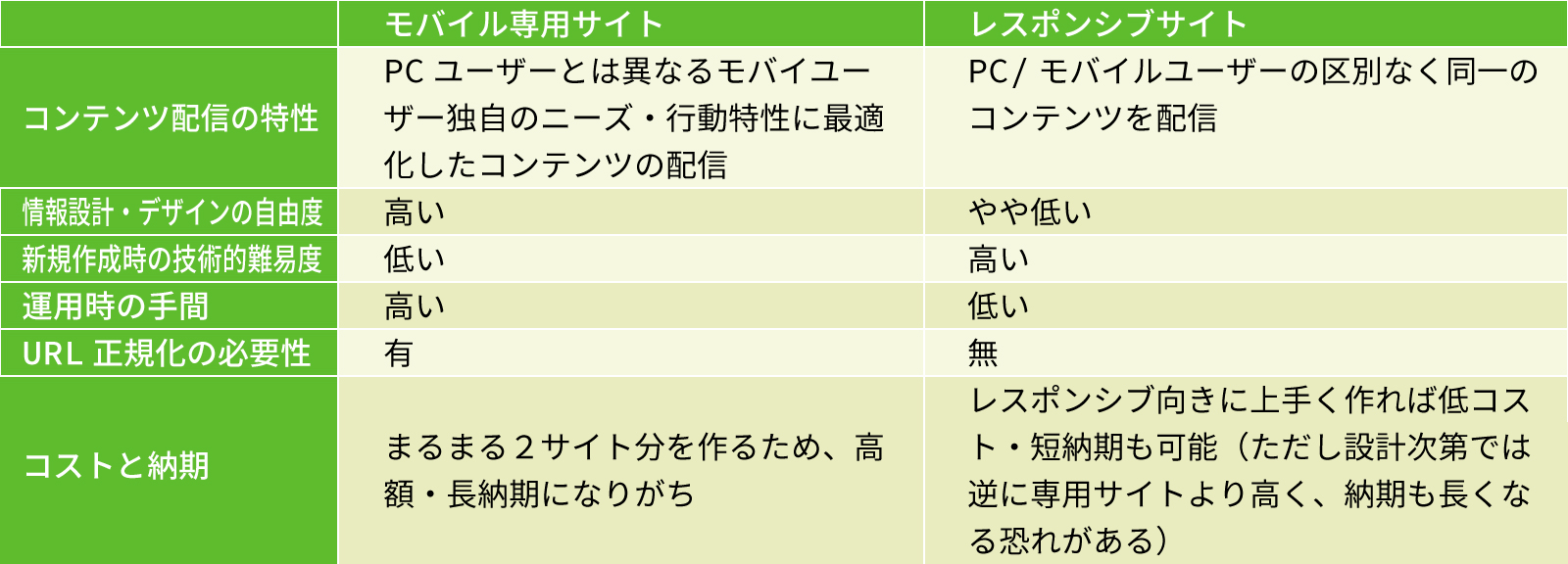 このように、専用サイトを構築することとレスポンシブ・ウェブデザインで構築することのメリット・デメリットは裏表の関係のような形となっています。まずは自らのWebサイトがどちらの手法に向いているか(どちらの手法がよりユーザーに高い価値を提供できるか)を判断し、その上で可能な限りデメリッ卜を軽減するための対策を講じるようにすると良いでしょう。
