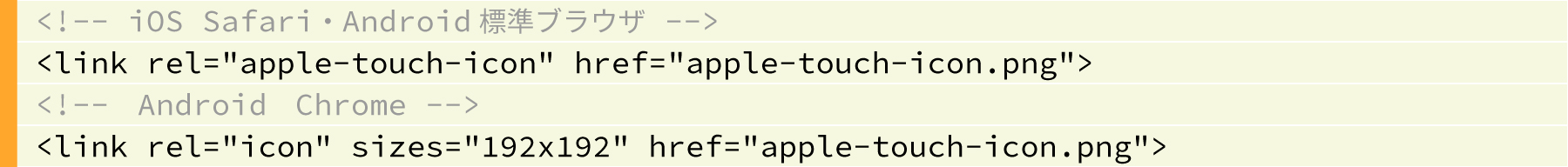 iOSデバイスは、「apple-touch-icon.png」という名前のpng画像を入れておけば自動認識してホームアイコンとして使用してくれます。しかしAndroidではHTMLに<link rel="apple-touch-icon"~>の記述をしないと読んでくれません。またAndroid Chrome はこの記述が将来的にサポー卜されなくなる可能性があるということですので、Google推奨の<link rel="icon"~>という記述をしておく方が無難です。