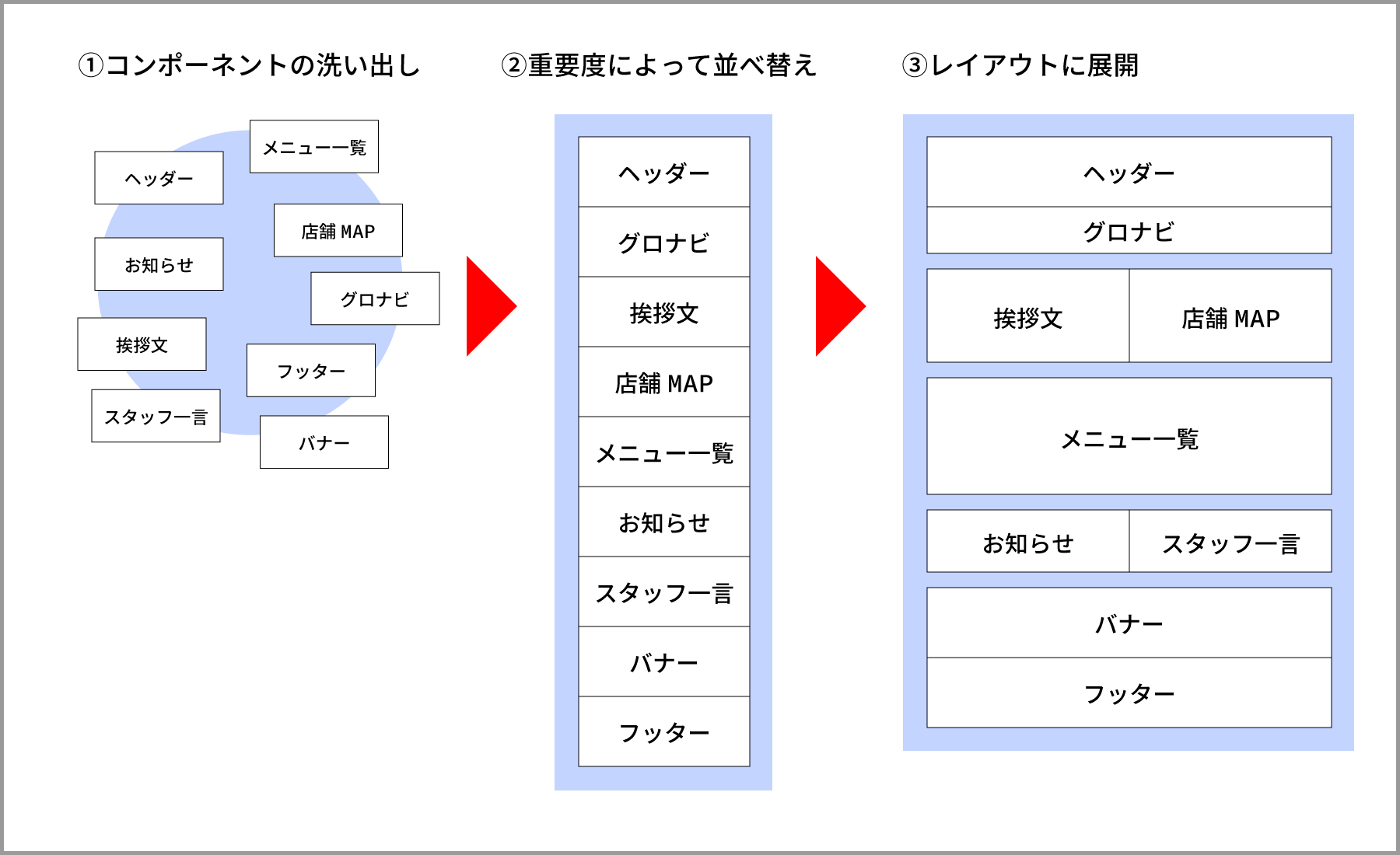 PC 向けのWebサイトの画面構成を考える際には、レイアウトを先に決めてその中にコンテンツ部品を並べ