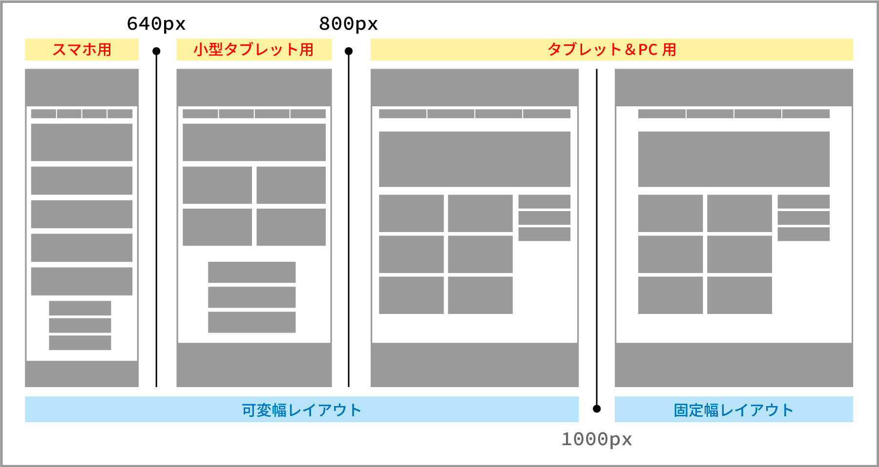 500~800px前後の中間サイズ付近は、コンテンツやレイアウトによって「スマホ向けレイアウトでは間延びしすぎる」「PC向けレイアウトで、は窮屈過ぎる」といった不具合が出やすいサイズとなります。従って最小と最大のブレイクポイン卜が離れすぎている場合には1~2箇所中間ブレイクポイントを追加した方が良いと思われます。