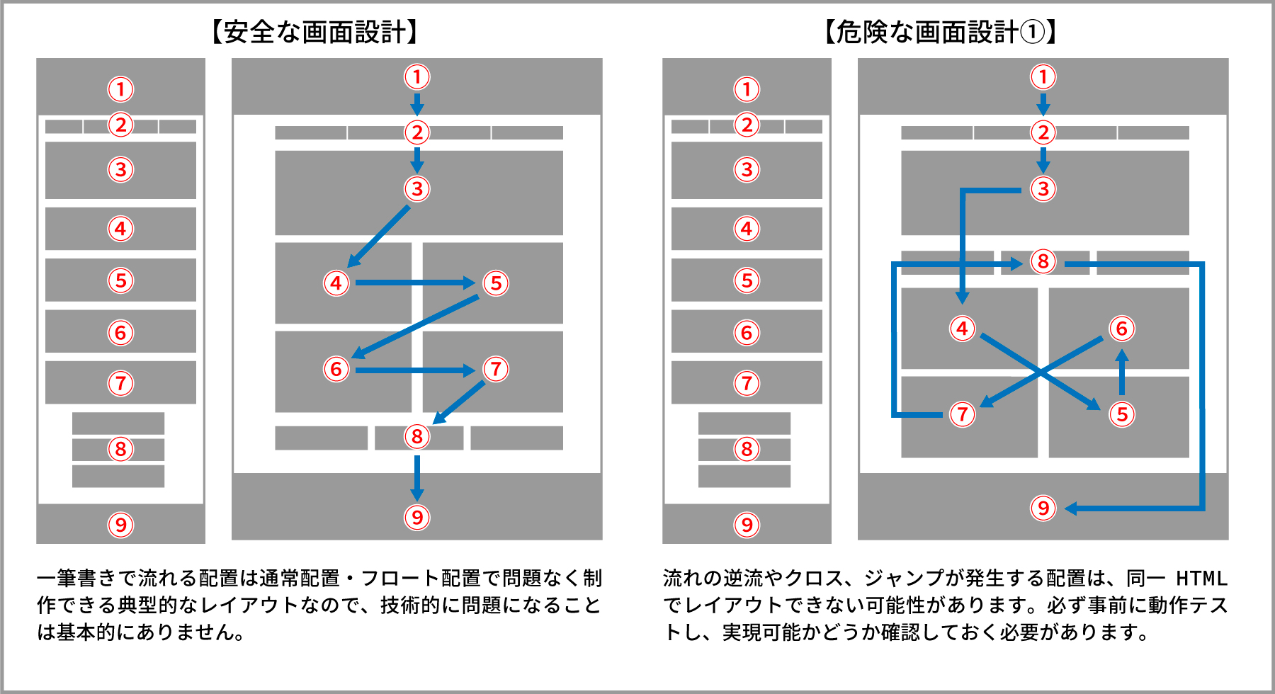 左の例のように連番を繋いだ線がスムーズに一筆書きで流れるような状態であれば、cssでのレイアウト上、技術的な制約はほぼ無いと考えて大丈夫です。逆に右の例のように繋いだ線が上下方向に行ったり来たりしたり、線がクロスするように複雑な流れになっている場合は、本当にそれがcssだけで、実現可能なのか必ず、事前に確認する必要があると考えてください。