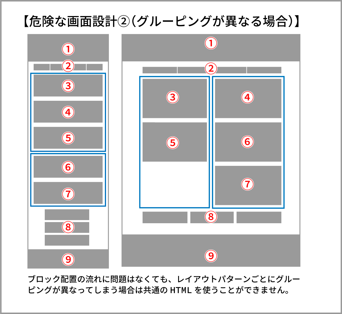 またこちらの例のように各ブロックの流れに問題はなくても、レイアウトによってグルーピング、が変わってしまうような設計は同一HTMLでのレイアウトができないため、避けるべき典型的な例となります。
